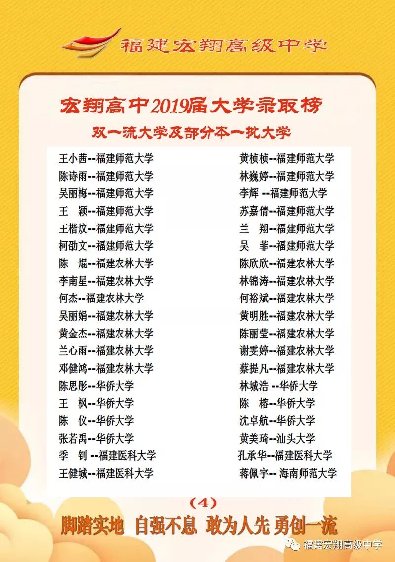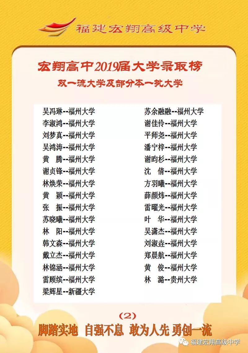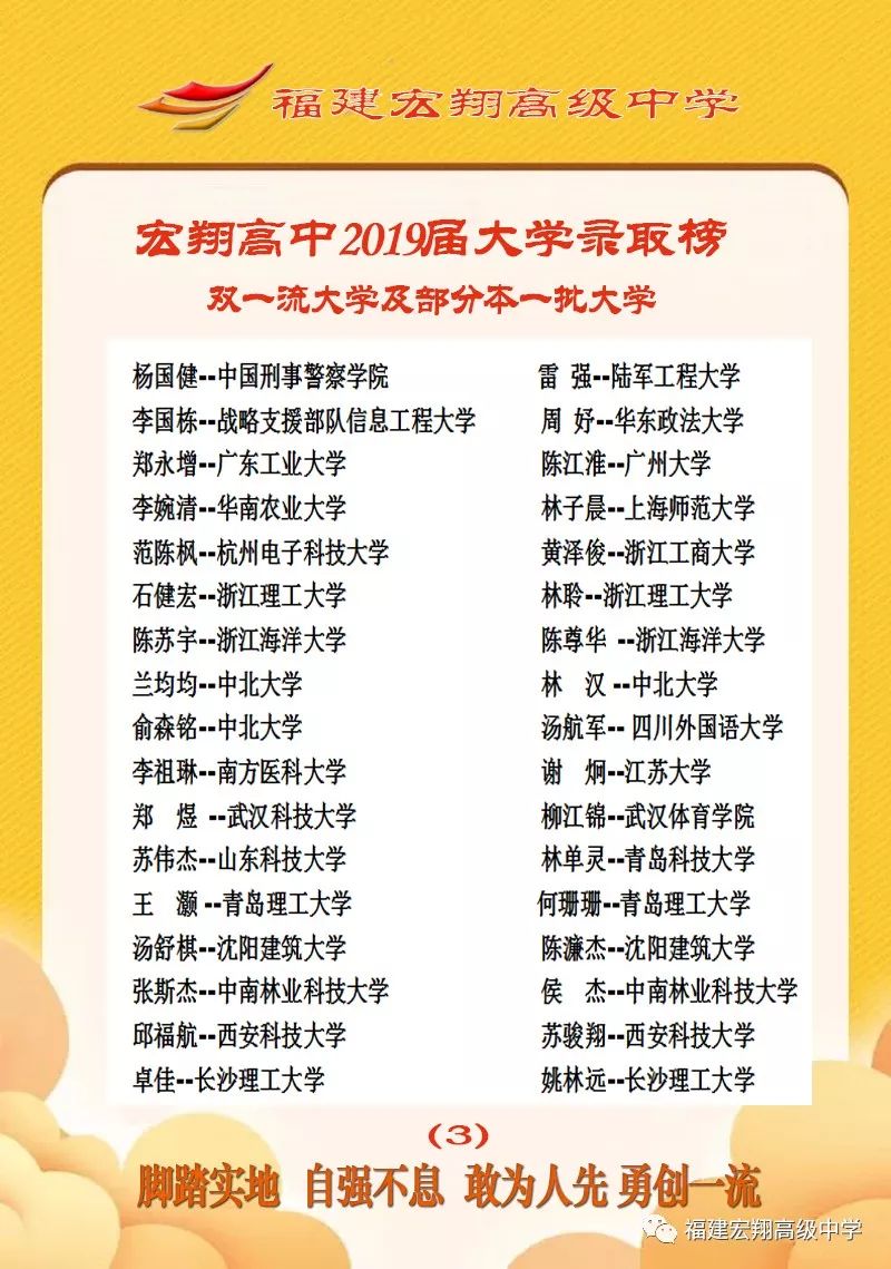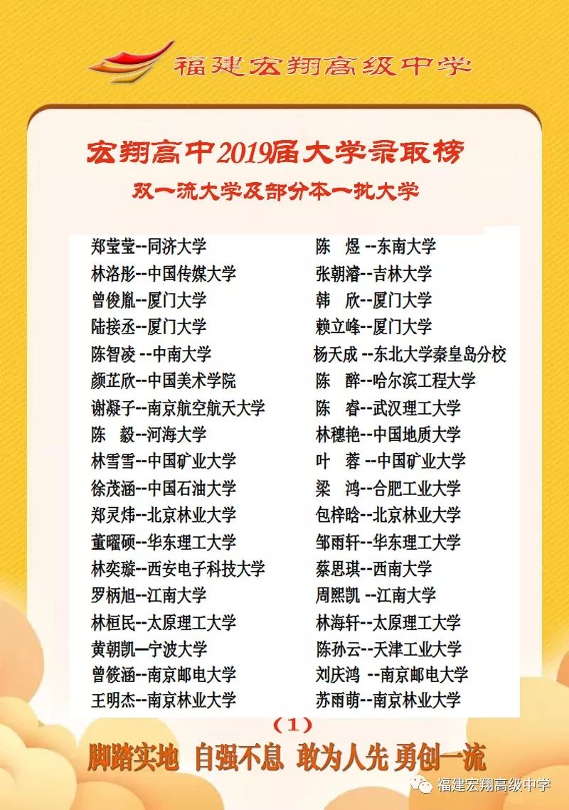 宏翔高中2019届高考录取榜(一)发表时间:2019-08-04 11:14 ![]() 点击上方蓝色字关注我们~ ![]() 勤奋耕耘又结丰硕成果,宏翔高中再谱绚丽华章!在2019年高考中,我校再传捷报:本一重点上线200人(不含体艺类),本一上线率26.6%,占全县本一上线总人数的40%;本科上线620人,本科上线率77.4%,占全县本科上线总人数的41%;本一和本科上线人数均进入宁德市高中前六位。林洛彤同学以615分摘取霞浦县文科第一名,曾俊胤同学以614分摘取霞浦县文科第二名。 近期,我校2019届毕业生陆续收到大学录取通知书,他们将带着自己的梦想和母校的期盼,踏上新的征程,开创一片属于自己的新天地。