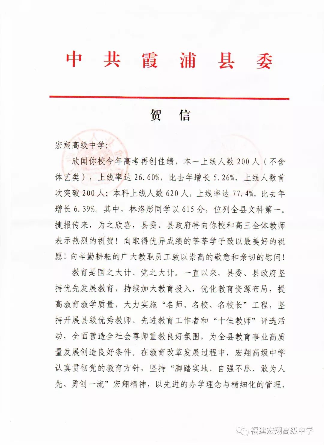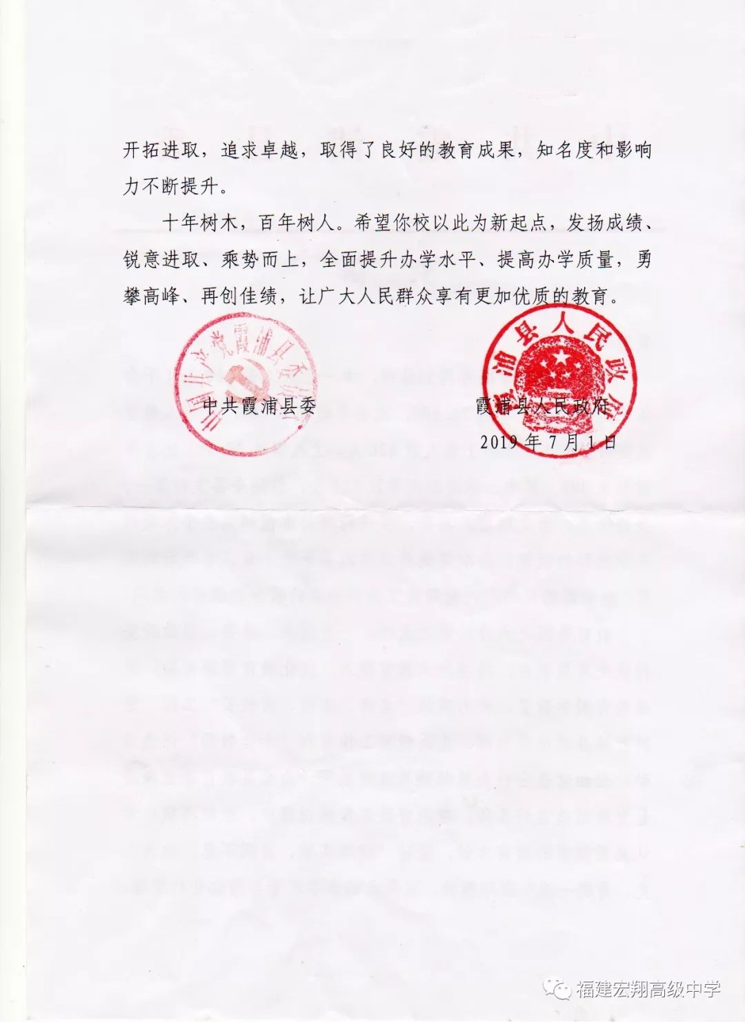 7月1日,正值中国共产党98华诞的喜庆日子,宏翔高级中学收到了县委县政府发来的高考贺信,祝贺我校2019年高考取得佳绩。