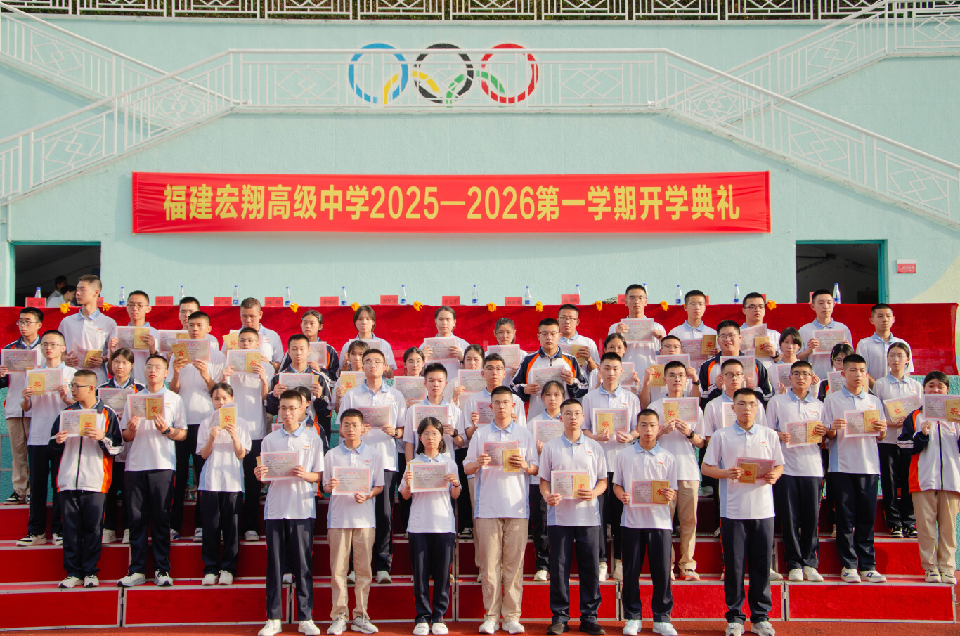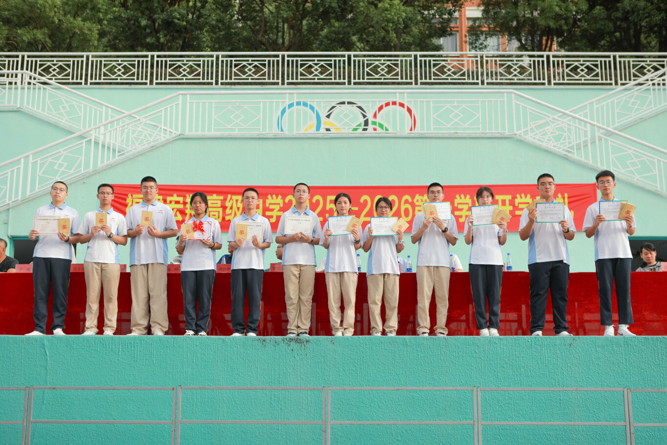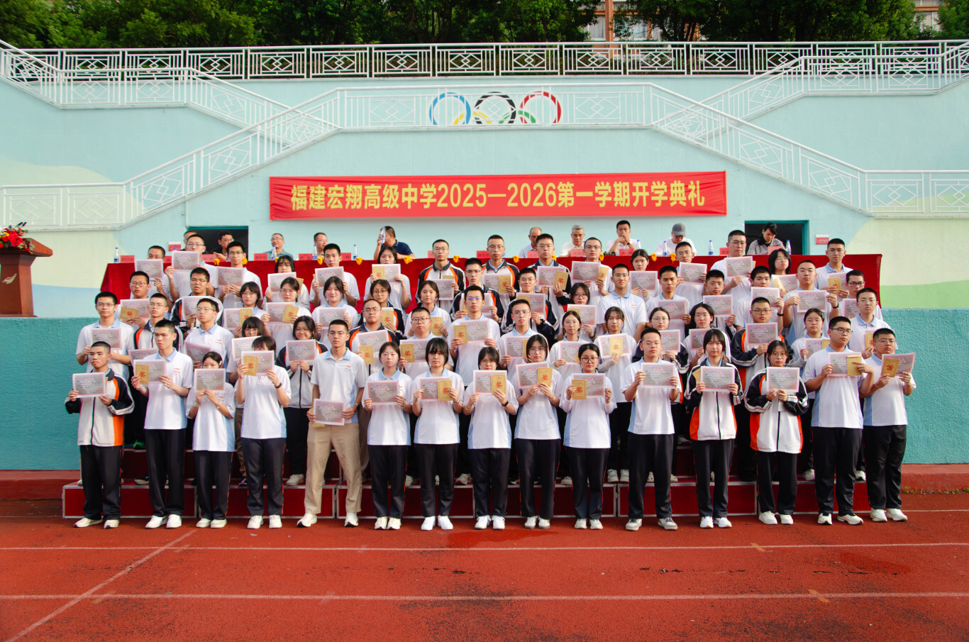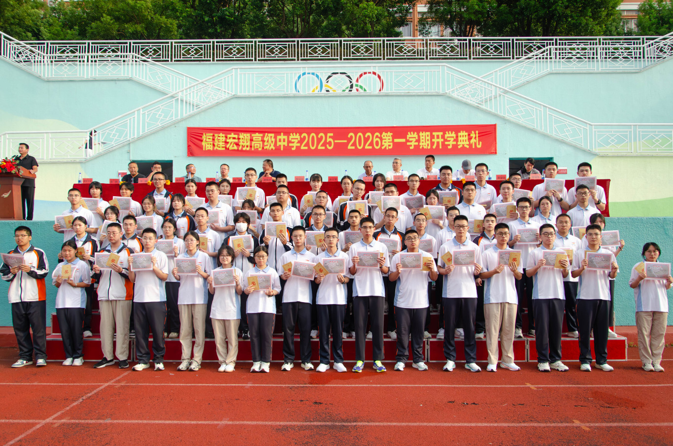 秋起新学,砥砺耕耘——宏翔高中2025-2026学年第一学期开学典礼发表时间:2025-09-03 17:29 ![]() 2025-2026学年第一学期开学典礼 9 月 2 日下午 4 点,阳光洒满校园,我校 2025-2026 学年第一学期开学典礼在操场隆重举行。全校师生齐聚一堂,以饱满的热情和昂扬的姿态,共同开启了新学年的征程。这不仅是一场仪式,更是一次对未来的展望。 我校执行校长郑宗安首先为开学典礼作新学期致辞。他对新同学和新老师的加入表示热烈欢迎,为校园注入了新的活力与希望。总结回顾了过去一学年,学校在教育教学、学科竞赛、文体活动等方面取得了斐然成绩,并对本学期的工作开展提出了新的目标,希望全体师生共同努力,再创佳绩。 ![]() 校长助理欧阳天涛主持典礼 ![]() 执行校长郑宗安致辞 颁奖环节 ![]() 时光流转,耕耘有声,今日,清风拂过校园,我们以表彰为证,以敬意为题,对一学期以来凝聚力强、学风浓厚的卓越班级,以及踏实求知、特长鲜明的优秀个人,郑重举办表彰仪式,既是回望来路的耕耘,更是奔赴新程的序章。 由校办陈榕主任宣读学科竞赛、科技创新、体育、艺术等比赛取得优异成绩的团体及个人获得者,教研室杨为金主任公布了统考“优秀班级”的获奖名单,德育处张群主任公布了“三好学生”、“优秀学生干部”和“校园之星”的获奖名单,教务处陆烨主任公布了本学期“宏翔奖学金”的获得者,并对以上获奖学生和获奖班级进行了颁奖。