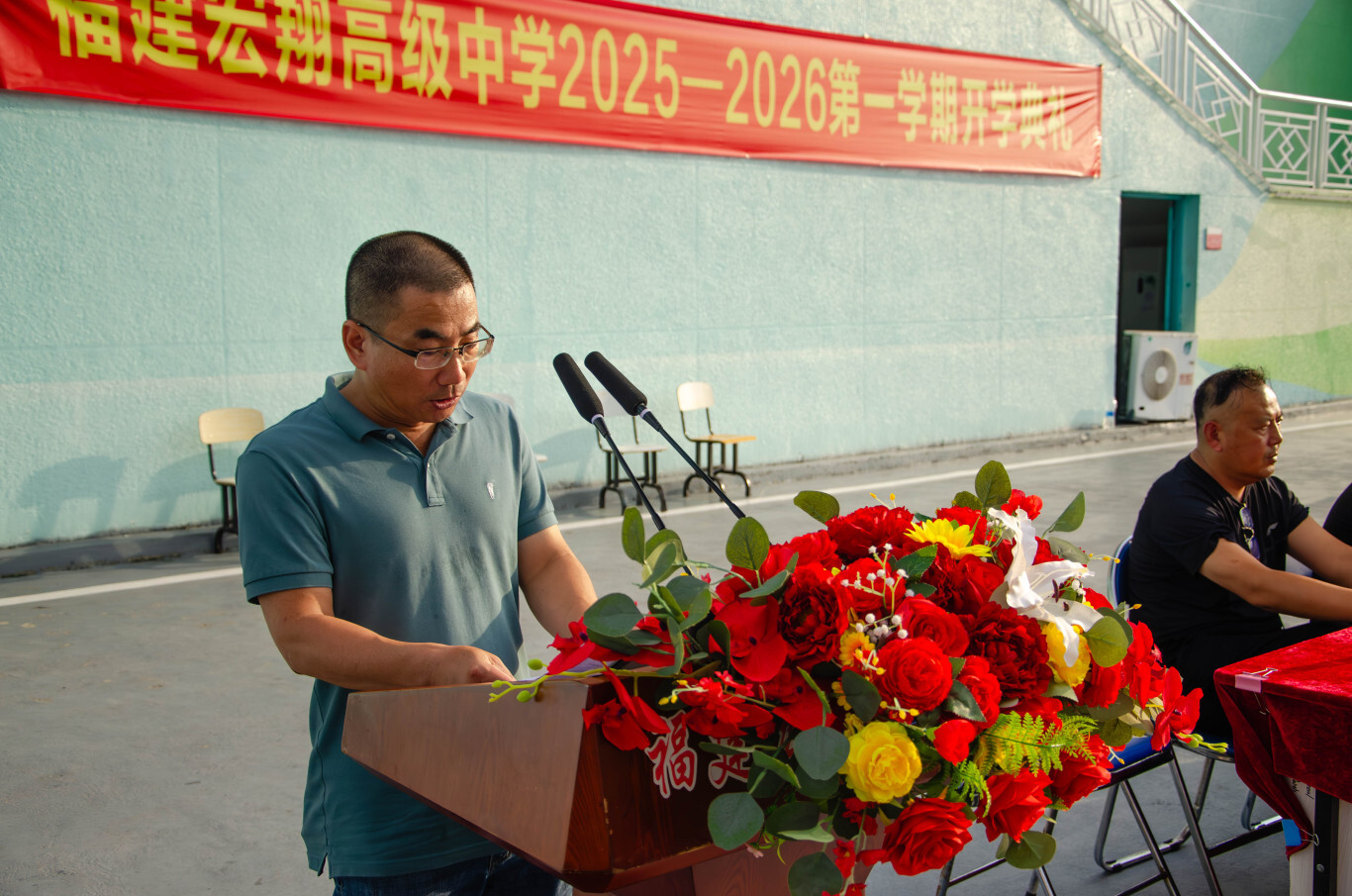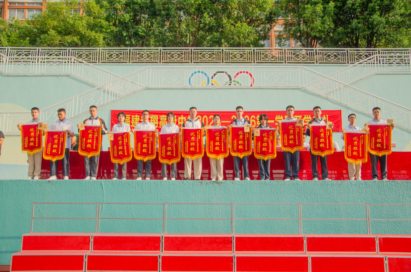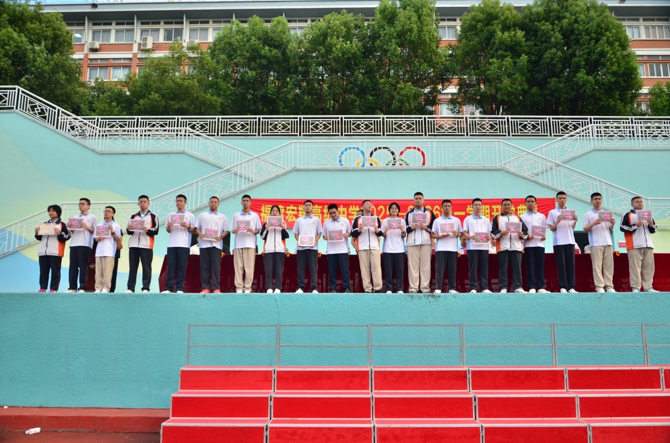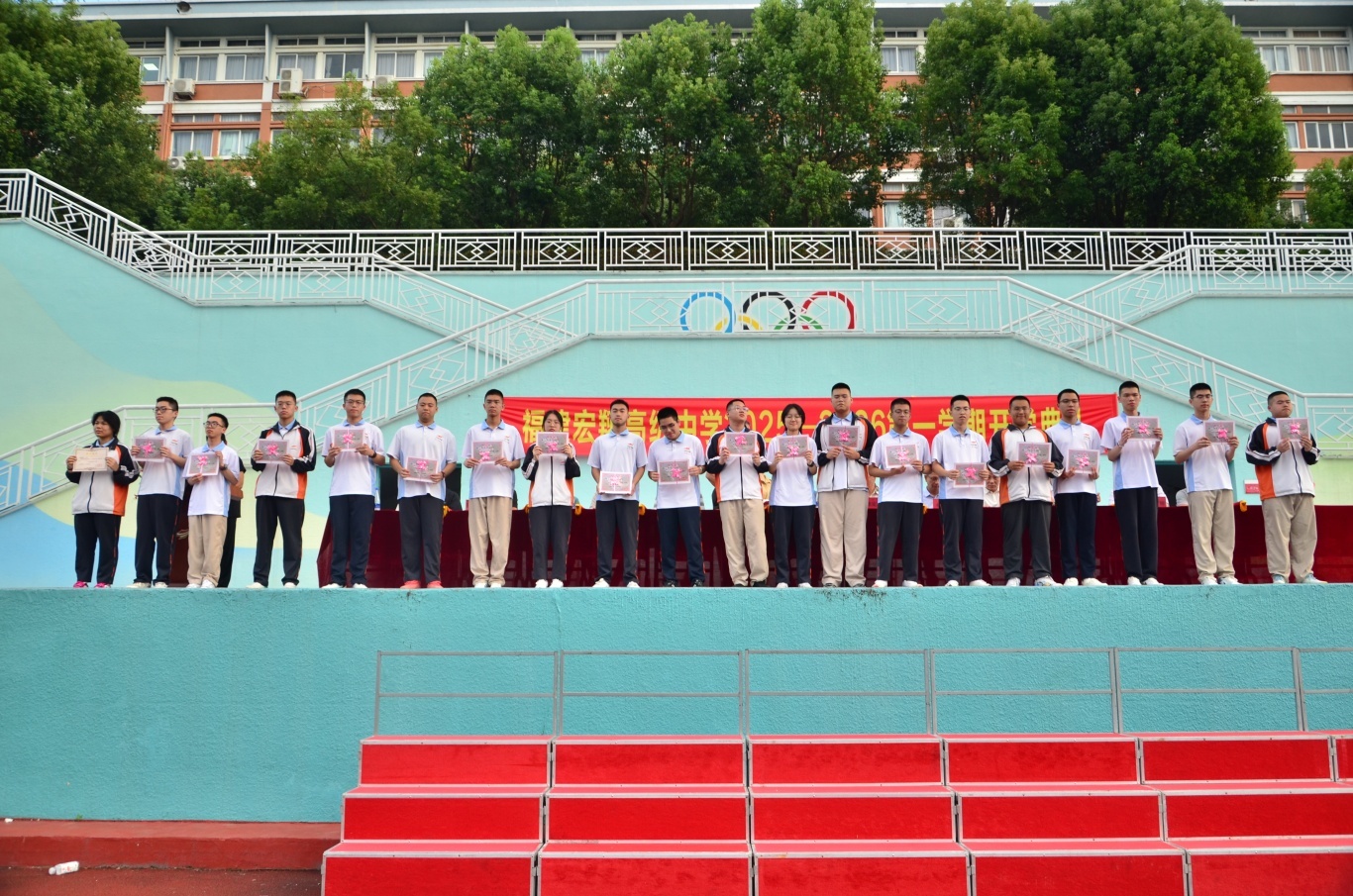 秋起新学,砥砺耕耘——宏翔高中2025-2026学年第一学期开学典礼发表时间:2025-09-03 17:29 ![]() 2025-2026学年第一学期开学典礼 9 月 2 日下午 4 点,阳光洒满校园,我校 2025-2026 学年第一学期开学典礼在操场隆重举行。全校师生齐聚一堂,以饱满的热情和昂扬的姿态,共同开启了新学年的征程。这不仅是一场仪式,更是一次对未来的展望。 我校执行校长郑宗安首先为开学典礼作新学期致辞。他对新同学和新老师的加入表示热烈欢迎,为校园注入了新的活力与希望。总结回顾了过去一学年,学校在教育教学、学科竞赛、文体活动等方面取得了斐然成绩,并对本学期的工作开展提出了新的目标,希望全体师生共同努力,再创佳绩。 ![]() 校长助理欧阳天涛主持典礼 ![]() 执行校长郑宗安致辞 颁奖环节 ![]() 时光流转,耕耘有声,今日,清风拂过校园,我们以表彰为证,以敬意为题,对一学期以来凝聚力强、学风浓厚的卓越班级,以及踏实求知、特长鲜明的优秀个人,郑重举办表彰仪式,既是回望来路的耕耘,更是奔赴新程的序章。 由校办陈榕主任宣读学科竞赛、科技创新、体育、艺术等比赛取得优异成绩的团体及个人获得者,教研室杨为金主任公布了统考“优秀班级”的获奖名单,德育处张群主任公布了“三好学生”、“优秀学生干部”和“校园之星”的获奖名单,教务处陆烨主任公布了本学期“宏翔奖学金”的获得者,并对以上获奖学生和获奖班级进行了颁奖。