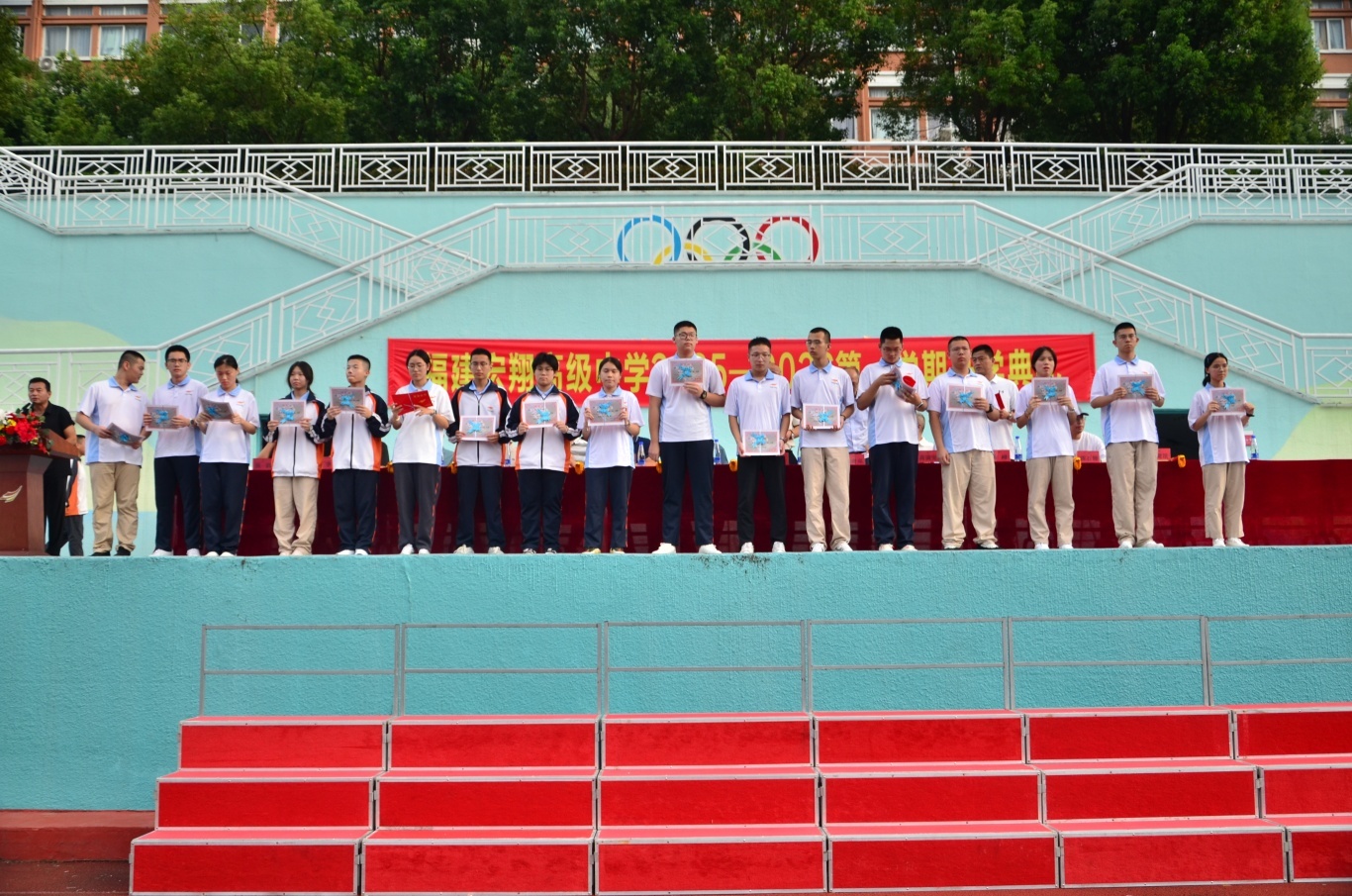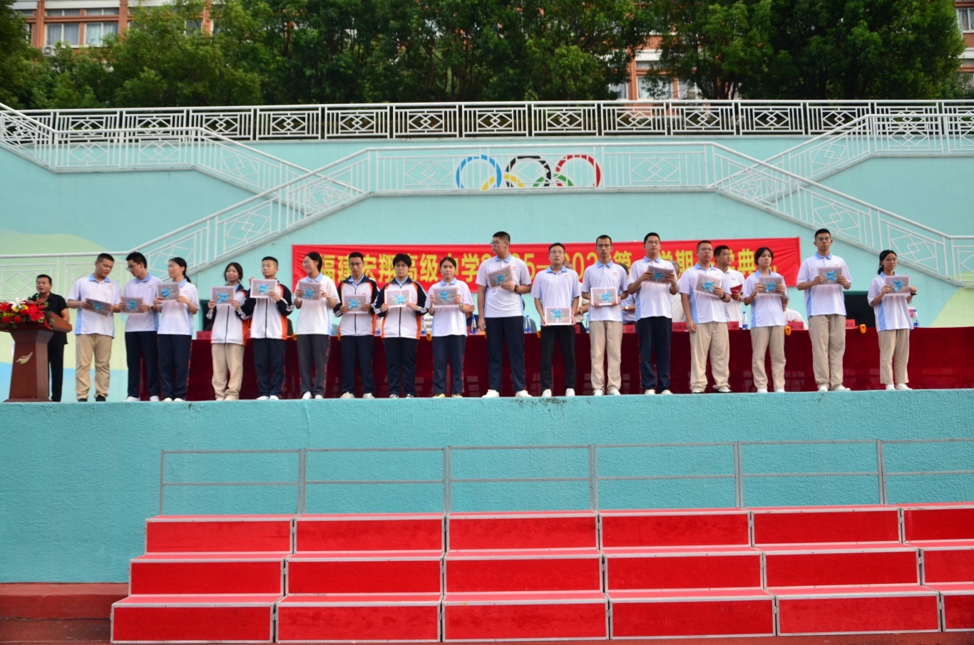 校办主任陈榕宣读学科竞赛、科技创新、体育、艺术等比赛取得优异成绩的团体及个人 ![]() 教研室主任杨为金宣读宁德市期末统考“优秀班级”获得者 ![]() 德育处主任张群宣读 “优秀学生干部”、“三好学生”及“校园之星”获得者 ![]() 教务处主任陆烨宣读“宏翔奖学金”获得者